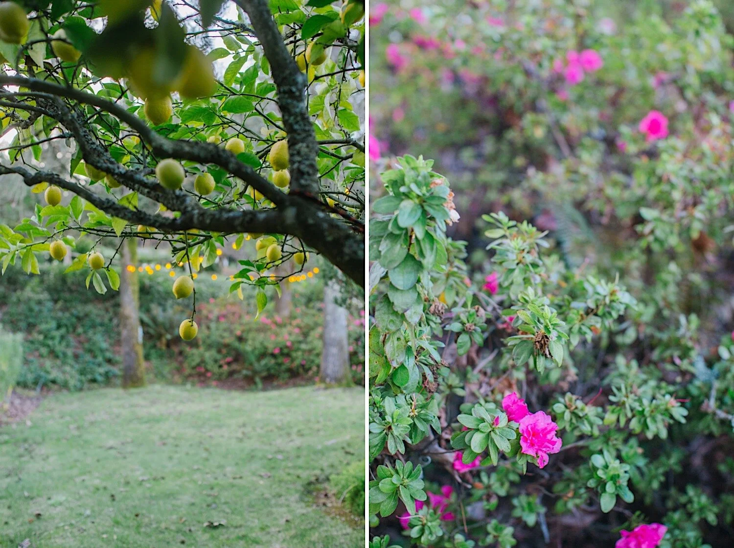 We walked the grounds and settled on this perfect little area that is slightly secluded, and has beautiful flowering bushes nestled behind some trees. Also, strung above were some market lights!
